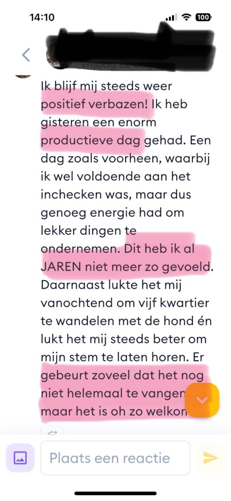 Dank je wel kristel voor je tijd. Gelukkig heb ik op dit moment niemand om mij heen met de ziekte. Zoals ik al aangaf voelde ik vroeger altijd al dat het anders kon. Gezegend dat dit steeds meer bekend wordt. Ik weet wel waar ik moet zijn als dit nodig zou moeten zijn. Ik geloof dat het me zou kunnen helpen! Maar heb het gelukkig niet nodig! Dankje wel voor het delen van je verhaal❤️